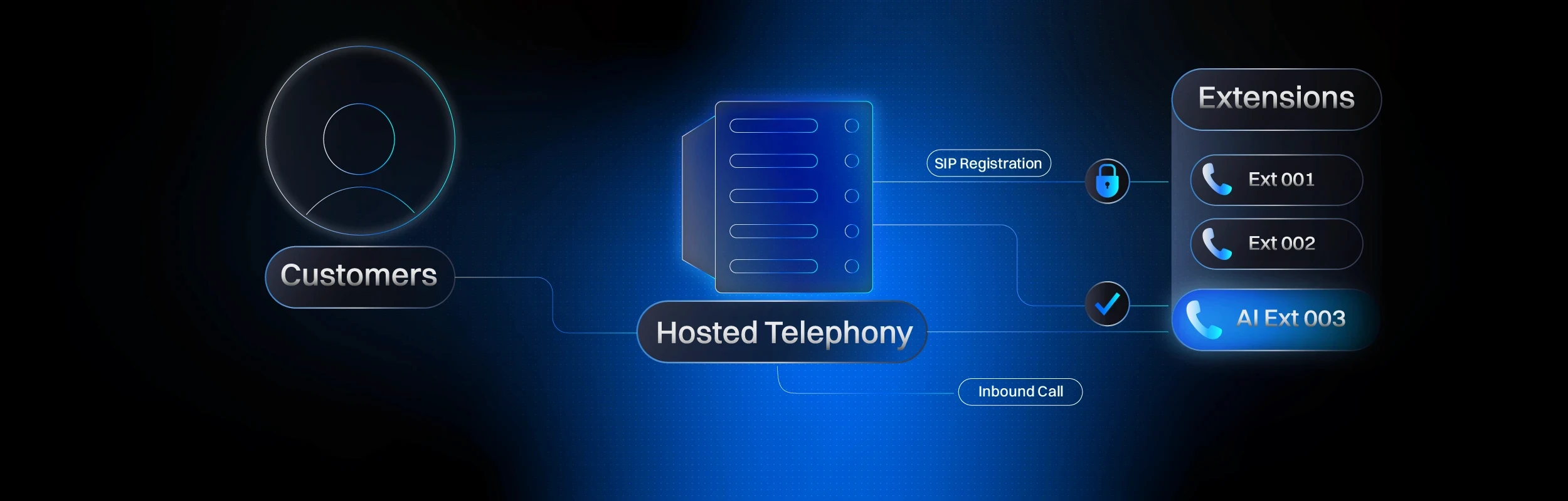 A2E allows an AI agent to register to a hosted telephony system in the same way as a SIP endpoint would. From the phone system’s perspective, it is another extension. From your customer’s perspective, it functions as a capable voice agent that enhances your workforce’s capability to deliver meaningful customer engagement.